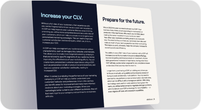 IncrIncrease yease your CLour CLVV.. PrPreparepare fe for the futuror the future.e. Without a full view of your customers, their experience with Why is 2023 the year you need to invest in a CDP? Your you can be fragmented and can cause a poor user experience. business likely thinks about expanding to new markets or A CDP can help improve your customer lifetime value (CLV) by products in the near future. Why would you not think about providing you with a more comprehensive and accurate view of making the same investment in your customer data? your customers, which can help you create more targeted and Year after year, marketers are being asked to do more with personalized marketing campaigns. This can lead to improved less. You need to focus on how you can break down silos and customer satisfaction and brand loyalty, which can, in turn, make as much of your work as possible less time-consuming. increase your CLV. This helps you and, ultimately, helps the company increase its overall operational efficiency. A CDP can help you segment your audience based on various characteristics, such as demographics, behavior, and interests. The ability to see a 360° view of your customer with a CDP will This allows you to create more targeted marketing campaigns increase your ability to create more personalized offerings, that are tailored to specific segments of your audience, hence improve targeting and improve return on investment. And as improving the effectiveness of your marketing efforts. You will data governance increases in importance, having a tool like a create more personalized customer experiences using a CDP, CDP will help you be better prepared for any compliance issues such as personalized emails or product recommendations, and or data laws that you may need to react to. improve customer satisfaction and loyalty, leading to increased CLV. Longer term, purchasing a CDP (vs building one) allows you to focus on actually using additional functionality instead of When it comes to analyzing the performance of your marketing trying to scale an internally-built platform. You only need to campaigns, a CDP will help you better understand your connect to one platform as new communication channels arise, customers’ behavior and preferences. In turn, this can help which can be difficult with a homegrown solution. With rising you identify areas for improvement and make more informed technology costs and full-suite solutions having been the decisions about your marketing strategies. When your norm, you will be better armed to negotiate stronger contracts, marketing is better suited to your different audiences, they will with the data in your CDP as leverage for more flexibility — or feel more loyal to your company and continue to do business even migrate off tools with redundant capabilities. with you. stitch.cx | 8