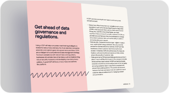 A CDP can make your legal team happy by addressing their concerns around: • Data privacy: We all know that non-compliance with privacy regulations, such as the General Data Protection Regulation GeGet ahead ot ahead of daf data ta (GDPR) in the European Union and the California Consumer Privacy Act (CCPA) in the United States, can mean gogovvernance and ernance and significant fines and loss of trust with customers. A CDP can provide tools and features that allow businesses to manage rregulaegulations.tions. and protect customer data, such as the ability to delete or anonymize data upon request. • Data security: Companies must be hyper-vigilant in today’s ever-evolving technology landscape. Security breaches Using a CDP will help companies meet their legal obligations are bad for business and all too common. A CDP can help related to data privacy and security. It can also help companies businesses protect customer data from unauthorized establish and maintain good data governance practices. CDPs access or breaches. CDPs should have security measures are a vital part of a comprehensive data management strategy. in place, such as encryption and access controls, to help To ensure compliance with relevant laws and regulations, ensure the security of customer data. businesses should also take other steps, such as implementing • Data governance: Without good data governance policies in robust security measures and developing clear data privacy place, it can be difficult for anyone in the company to handle policies. A good CDP will have privacy measures built into where and how data is stored. A CDP can help businesses the platform. establish and enforce policies and procedures for managing and using customer data in a way that is compliant with relevant laws and regulations. This can include tools and features that help businesses track and audit their use of customer data, as well as tools for managing consent and permissions. stitch.cx | 6