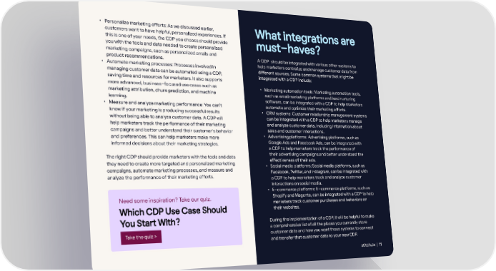 • Personalize marketing efforts: As we discussed earlier, WhaWhat int inttegregraations artions are e customers want to have helpful, personalized experiences. If this is one of your needs, the CDP you choose should provide musmust-havt-haveses?? you with the tools and data needed to create personalized marketing campaigns, such as personalized emails and product recommendations. A CDP should be integrated with various other systems to • Automate marketing processes: Processes involved in help marketers centralize and manage customer data from managing customer data can be automated using a CDP, different sources. Some common systems that might be integrated with a CDP include: saving time and resources for marketers. It also supports more advanced, business-focused use cases such as • Marketing automation tools: Marketing automation tools, marketing attribution, churn prediction, and machine such as email marketing platforms and lead nurturing learning. software, can be integrated with a CDP to help marketers • Measure and analyze marketing performance: You can’t automate and optimize their marketing efforts. know if your marketing is producing successful results • CRM systems: Customer relationship management systems without being able to analyze customer data. A CDP will can be integrated with a CDP to help marketers manage help marketers track the performance of their marketing and analyze customer data, including information about campaigns and better understand their customer’s behavior sales and customer interactions. and preferences. This can help marketers make more • Advertising platforms: Advertising platforms, such as informed decisions about their marketing strategies. Google Ads and Facebook Ads, can be integrated with a CDP to help marketers track the performance of The right CDP should provide marketers with the tools and data their advertising campaigns and better understand the they need to create more targeted and personalized marketing effectiveness of their ads. • Social media platforms: Social media platforms, such as campaigns, automate marketing processes, and measure and Facebook, Twitter, and Instagram, can be integrated with analyze the performance of their marketing efforts. a CDP to help marketers track and analyze customer interactions on social media. • E-commerce platforms: E-commerce platforms, such as Need some inspiration? Take our quiz. Shopify and Magento, can be integrated with a CDP to help marketers track customer purchases and behaviors on Which CDP UWhich CDP Use Case Should se Case Should their websites. YYou Start Withou Start With?? During the implementation of a CDP, it will be helpful to make a comprehensive list of all the places you currently store Take the quiz > customer data and how you want those systems to connect and transfer that customer data to your new CDP. s stittitch.cch.cx x || 11 11